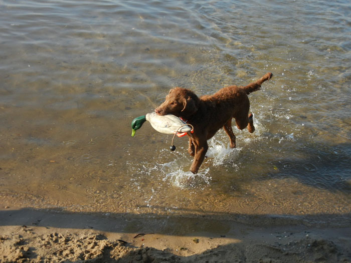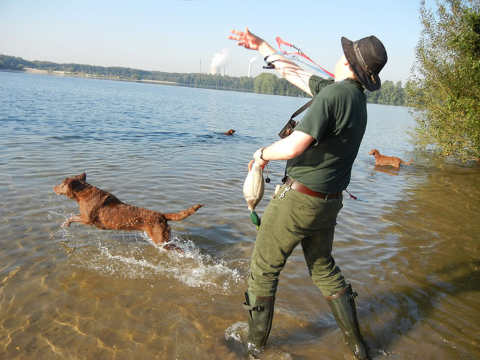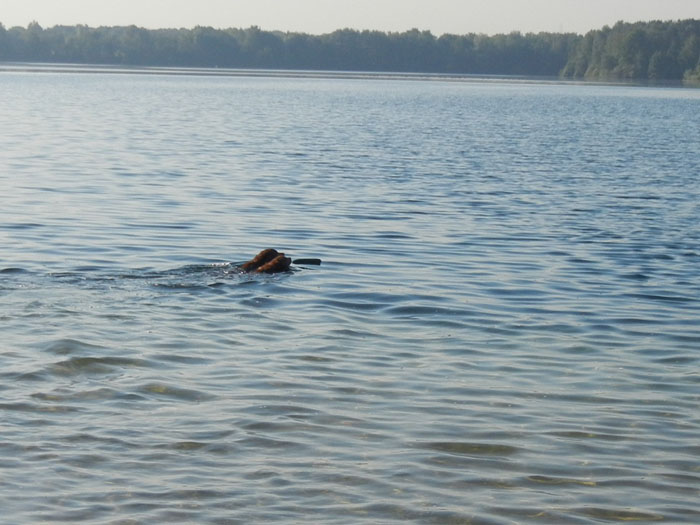 Highlight des Samstamorgens am See war, das Tony seiner Mama Sally im Wasser das Dummy klaute, schnell wegschwamm und dann stolz an Leo apportierte. Das war übrigens Sallys großes schweres Entendummy für den erwachsenen Hund…